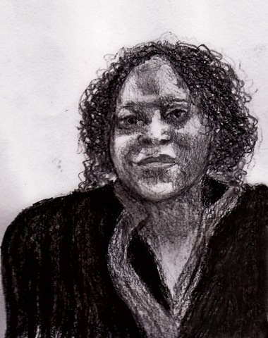 So I set the pattern sheet aside, and got out my sketchbook, instead, and decided to use my meditative pain management methods instead.   I needed to NOT control that hand, because it was not in a state of control, but I DID need to calm myself down, at a minimum not increase the spasms, and try to reduce the pain.  Starting from there just meant focusing on easy marks—squiggles in this instance—and she caught my eye.  I didn’t tell her that I started sketching her while she sat at the window, as I waited to be taken back to see the doc. It because with focusing on her beautiful hair, the soft spirals felt comfortable and relaxed, small enough not to be too taxing, and then I was noticing the graceful curves all over her face, and the way the overhead lights created powerful contrasts against her deep brown skin.  I don’t know how exactly to put words to the feeling of having my gut, eyes, and hands connect powerfully when I was drawing her, as if they knew exactly what to do, like my hands felt exactly what marks to make, and it was resonating from vibes that I got from her.   I only had a very rough sketch at this point, and then they called me back to see the doc.