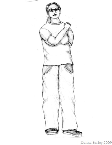 She really didn’t smile much, and didn’t talk to people very often. Mostly she acted like she wanted to be alone, but really, she was lonely. She was chubby and had poor body image and very low self esteem. But when she decided to talk to me, I found out that she was really nice and interesting, and honest, and had a lot to say that I thought was very worth saying. I don’t my siblings ever really got to know Sonja, which is too bad, because she was worth knowing. I really hope that she has a lot of peace in her soul now. I really liked her. It just seems unfair to me, that I feel like she never really had a chance. This is just a quick sketch, and I had no reference photos of Sonja, either from childhood or as an adult, but this is how I remember her back then. I may do a more finished picture
