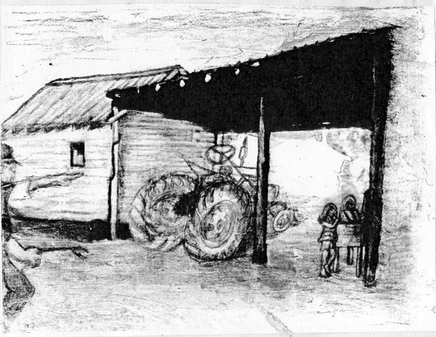 This is a sketch of the time that my cousin Jan and I got into the dog food bin where Granddaddy kept Chatham dog food for his rabbit dogs (beagles).  I had climbed all the way into the bin and was sitting on the dog food and eating it, and Jan stood there eating it, too.  We were surprised at what this dog food tasted like, because it was full of grain, and not like we expected dog food to taste.  At this point, Jan was just telling me that if Granddaddy caught us with me sitting in his dog food he was going to take a switch to us.  And it was right at that moment that Granddaddy walked up behind us and started fussing.  He had a funny way of fussing at us, that was about the only time that any of us girls ever heard his voice, by the way.  And his way of scolding us sounded a bit like someone herding cattle, and not used to talking a lot.