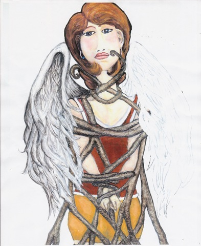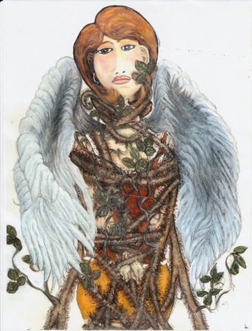 Here, I decided that what I was feeling was that I had the ability to do really great things and could fly in the figurative sense, at least, and had done so many times in my career and personal life on multiple levels.   But what I was feeling was constrained by various things, and I wasn’t sure what to do about that.  The longer it took for me to get past the things that were getting in my way, the more confined I was feeling, and the more difficult I thought it would be for me to overcome this.  Here are the beginnings of wings and strangling vines (actually poison ivy, which will become more apparent in subsequent stages).  I was pleased with the concept, but these things needed more work.