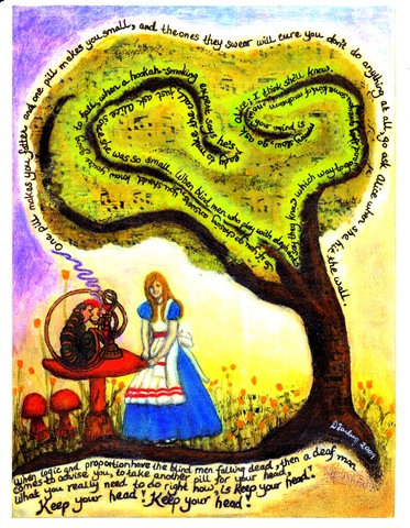 Ok, the “art and technique” of it all first.  This was done on 9” x 12” 120 lb cold-pressed watercolor paper in mixed media, with altered image transfer (only the hookah-smoking caterpillar) which I redrew and painted, so little of the original image was left intact, and the rest is entirely my original work.  The tree was sketched and painted on a page of sheet music printed in reverse (intentionally part of the theme), which was collaged on, then further refined with the rest of the composition.  This is the first time I have actually used this textured paper, mainly because I liked working on smooth paper with my other journal pages, but this paper was thicker and I needed something that could hold up to the heavy layers of media that I seem to apply, which had posed some difficulty with my previous pages, trying to put them on sheets of sketch paper (they buckled easily).