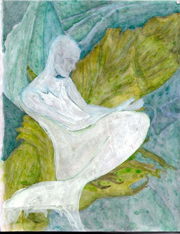 Ok, this is not the first phase of this new piece, just because I failed to scan the earliest step, but this will have to stand as Stage 1 (b).  Stage 1(a) was the background, which was drawn in graphite, then shaded to get values, then light colored pencils, followed by watercolor, and it isn’t finished yet.  There is still more detailing and shading to be done to the background.  Stage 1(b) was drawing the main image and adding gesso to it for opacity.  There is still more drawing and painting to do, including the hair and detailing of the image, and there will be an additional image that will be painted in, which will enable the background to show through.  There will also be an additional image incorporated that I drew earlier in the week.  Ultimately, this piece will incorporate graphite, colored pencil, oil pastels, various acrylic media, and layers of collaged tissue layers—all my original work.   While I think that it’s obvious that the beginning of my main image clearly has a mermaid in it, this piece will have a surprise ending, so stay tuned!