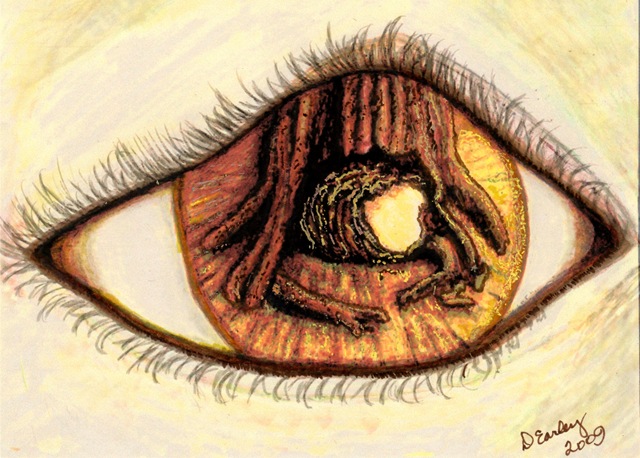Having said that, I did actually succeed in incorporating holes into this image—in more ways than one.  I managed to dig very deep scratches into the thin paper, especially throughout the hole at the base of the tree that is also the pupil of the eye.  You see, as my “road rage” escalated,  I dug deeper into the paper with the pencils.  And this little drama that played itself out last night reveals the theme of holes, as well.  It showed me “holes” in my own thought processes, and in fact is a real metaphor for experiences that I’ve had in my larger life, as I have fallen into similar holes in other ways, using a similar strategy.  Food for thought!