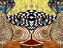 Been just playing around with a zentangle that I did as a bedtime wind down kind of exercise. If you don’t know what zentangles are, go Google it. It’s basically a kind of doodling, that’s related to drawing mandalas (another word you can google), that gets your zen thing working, stimulates creativity, unplugs the stress parts of your brain. But after I mindlessly did it, the next day, I found that it was fun to play with it, and there were all kinds of optical illusions in it, when I carved it up different ways and put it back together. Even my husband started seeing things in the various alignments! Here are a few examples, but I am also doing some new art pieces incorporating some of the patterns that emerged, which I’ll throw up later. It loosened and relaxed me so much that I had a really productive day today, after several bad pain days in a row. It was pretty cool!
